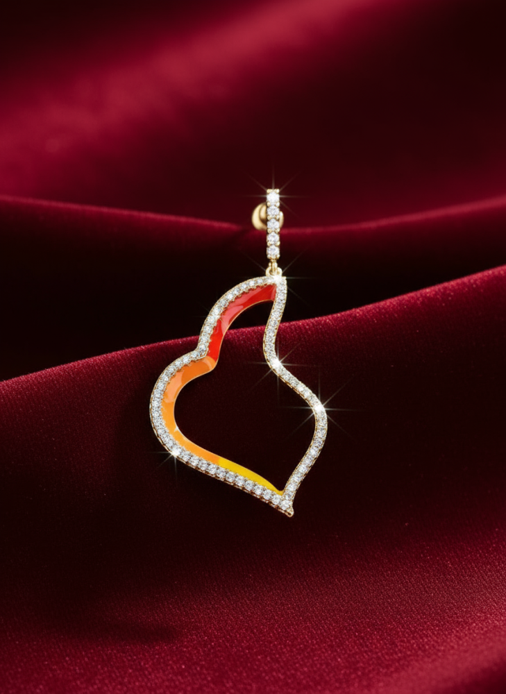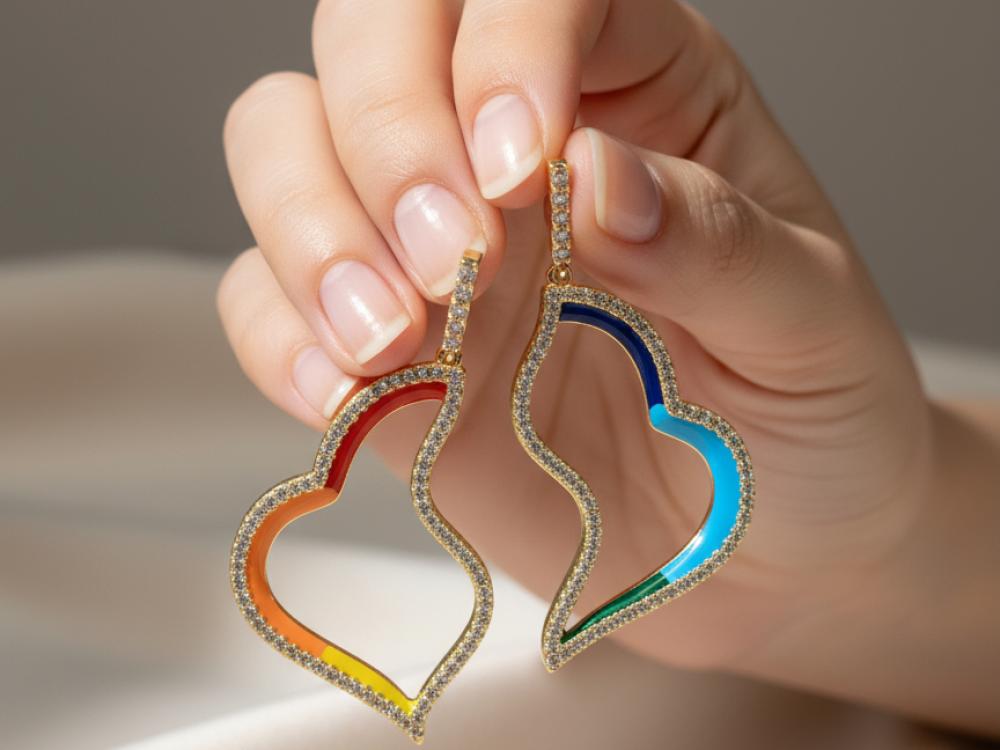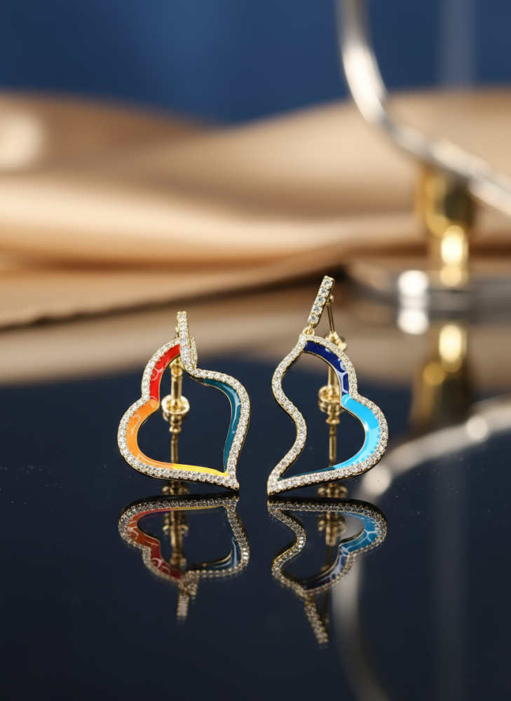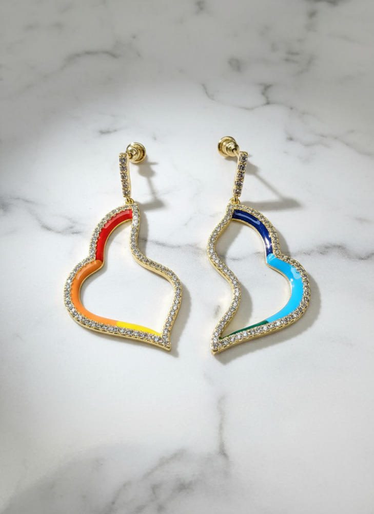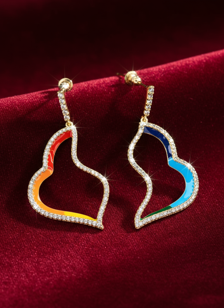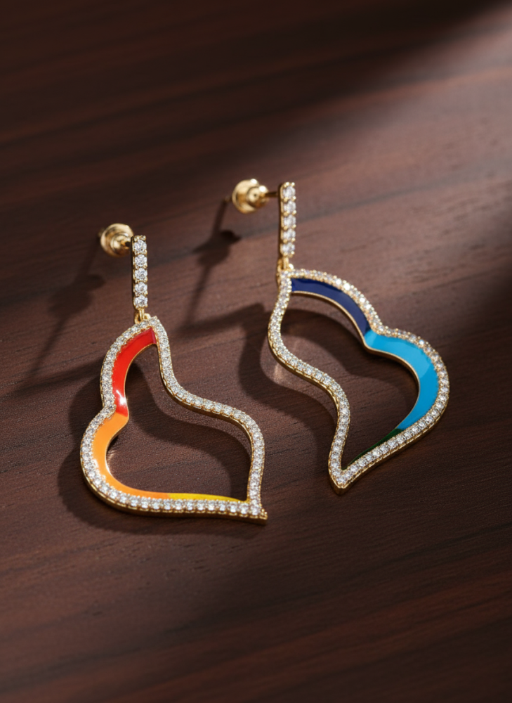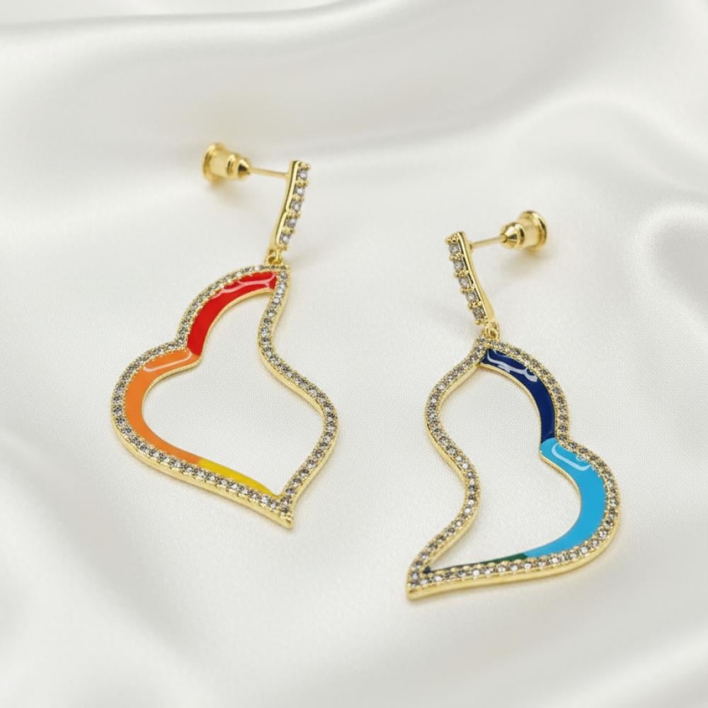 أضيفي لمسة جريئة وفنية لإطلالتك مع أقراط القلب الملونة المتألقة 💖🌸! تصميمها المتموج وغير المتماثل يجعل كل قرط تحفة فنية بحد ذاته، حيث تمتزج ألوان زاهية وجريئة مع بريق الأحجار المتلألئة لتضفي على وجهك إشراقة لا تُقاوم 🌸💖.