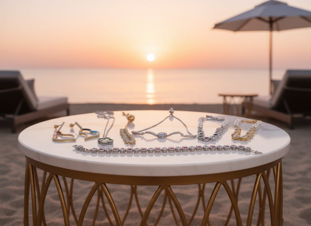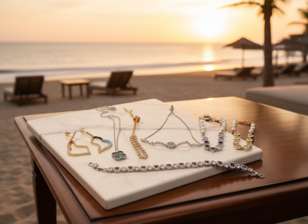 أما الأقراط فهي لوحة فنية بحد ذاتها: أقراط القلب الملونة المتألقة تضيف لمسة مبهجة لوجهك وتجعل ابتسامتك أكثر إشراقًا. ولأن الحظ دائمًا يرافق الجميلات، جاءت قلادة البرسيم الأخضر لتكون رمزًا للأناقة الخالدة والتفاؤل. وأخيرًا، يكمل البكج سوار الحجر الأزرق الفضي الذي يعكس بريق البحر وصفاء السماء، ليمنحك إحساسًا بالهدوء والفخامة في آن واحد.