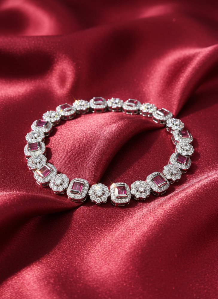 - سوار فضي فاخر مرصع بالأحجار الحمراء والشفافة – بريق يجمع بين الجرأة والأناقة