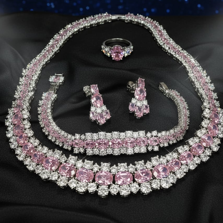 استمتعي بإطلالة لا تُنسى مع هذا الطقم الفضي الفاخر، الذي يجمع بين الأناقة الكلاسيكية والبريق الساحر للأحجار الوردية 🌸. الطقم الكامل يشمل عقداً، سواراً، خاتماً، وزوجاً من الأقراط، جميعها مصممة بأسلوب متناغم ليكون محور اهتمامك في أي مناسبة.