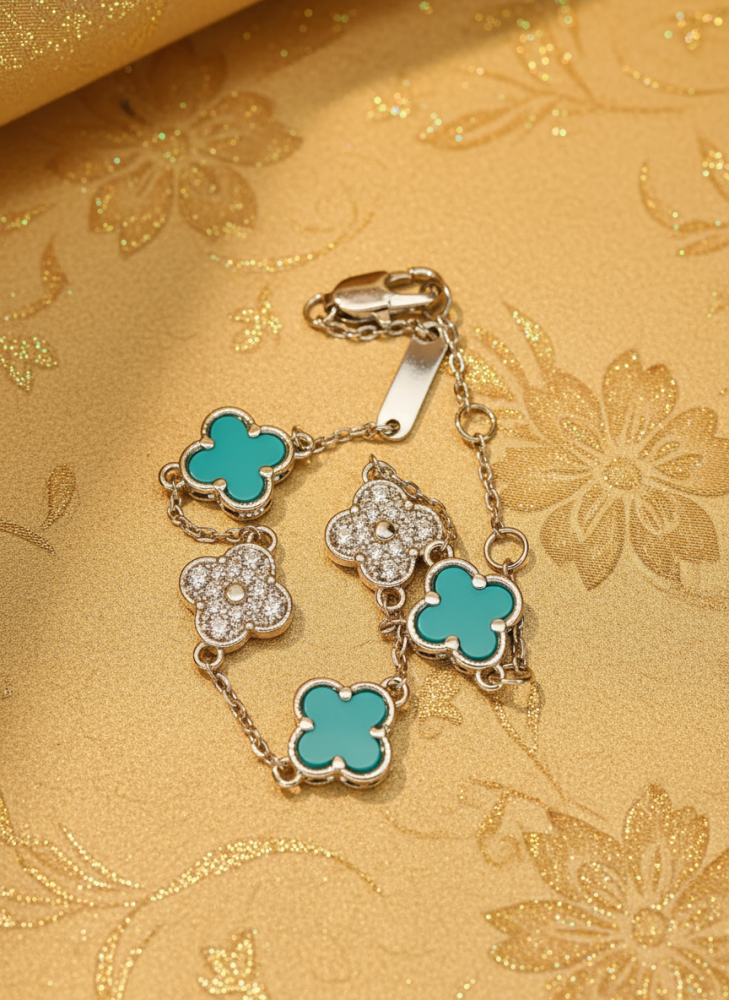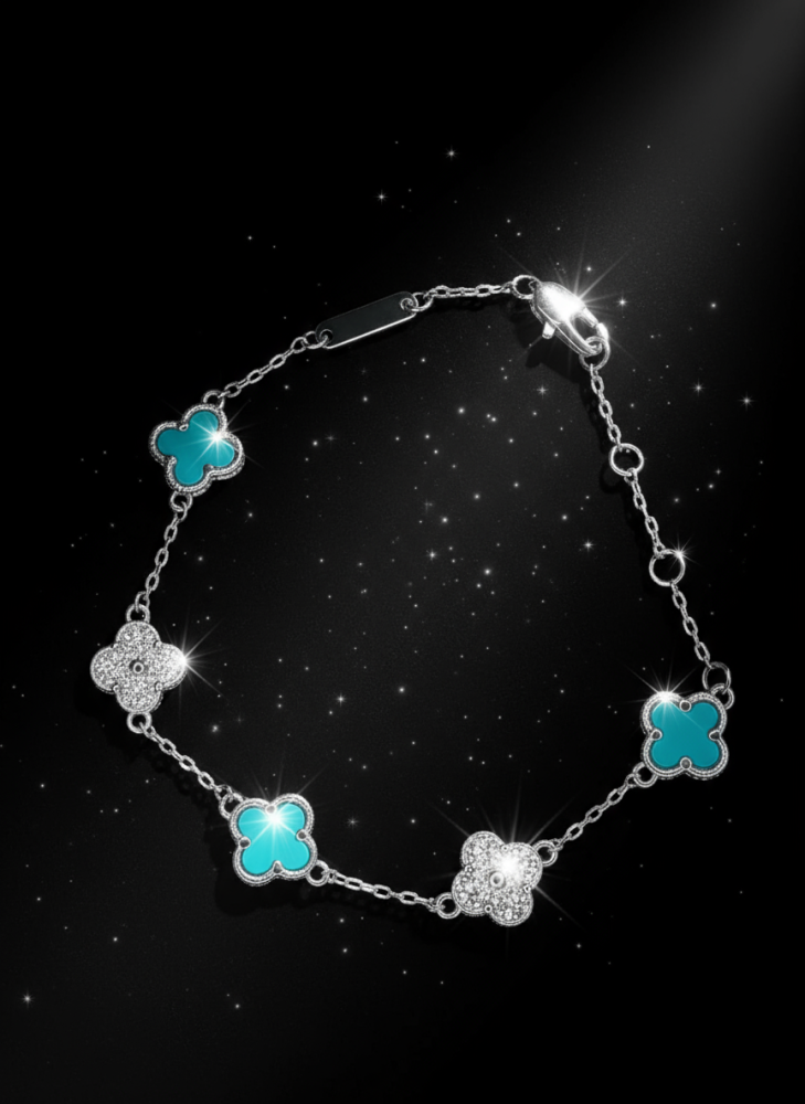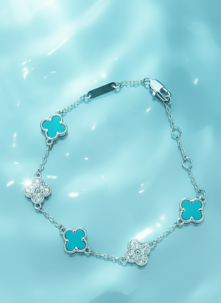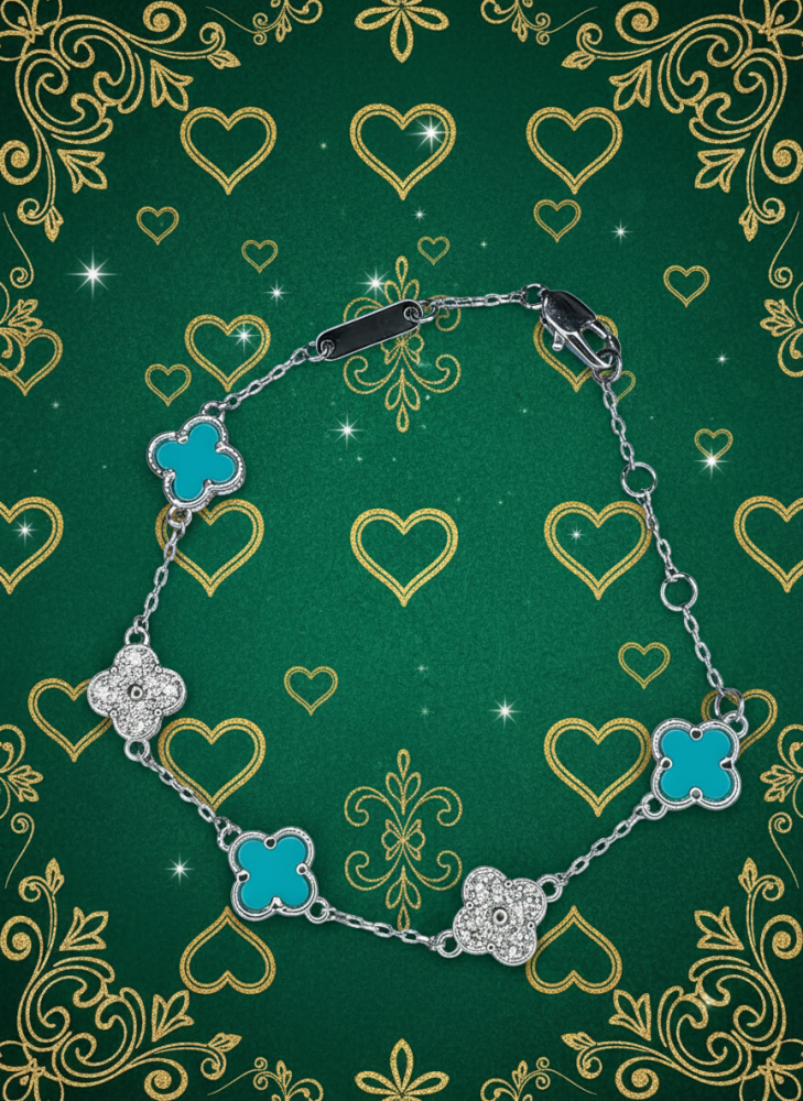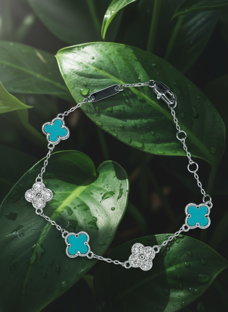 أضفي لمسة من الحيوية والأناقة إلى إطلالتك مع هذا السوار الفضي الرقيق، المزود بقلادات على شكل البرسيم رباعي الأوراق 🌸. التصميم يجمع بين اللون الفيروزي المنعش والبريق المتلألئ للزركون، ليمنحك قطعة مجوهرات مميزة تلفت الأنظار في كل مناسبة.