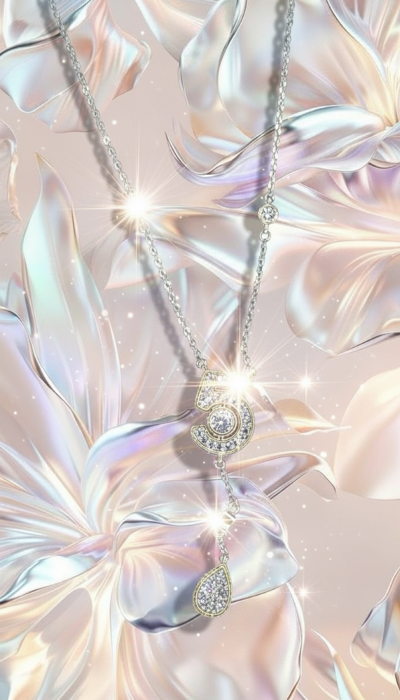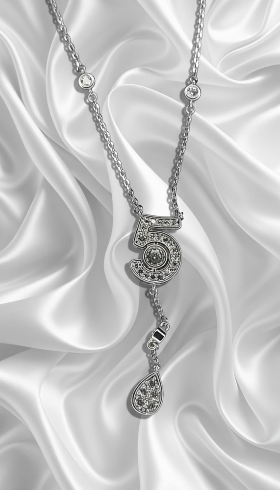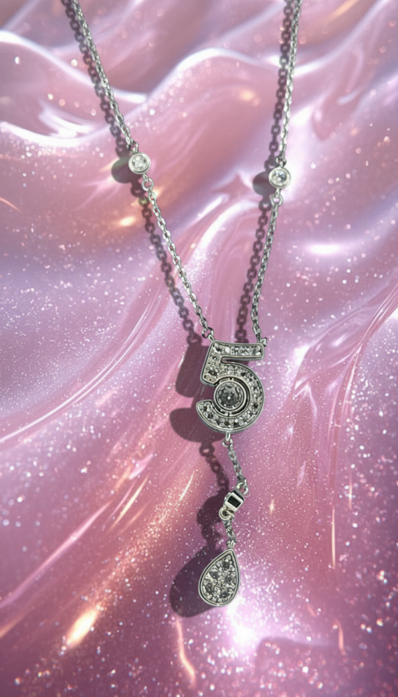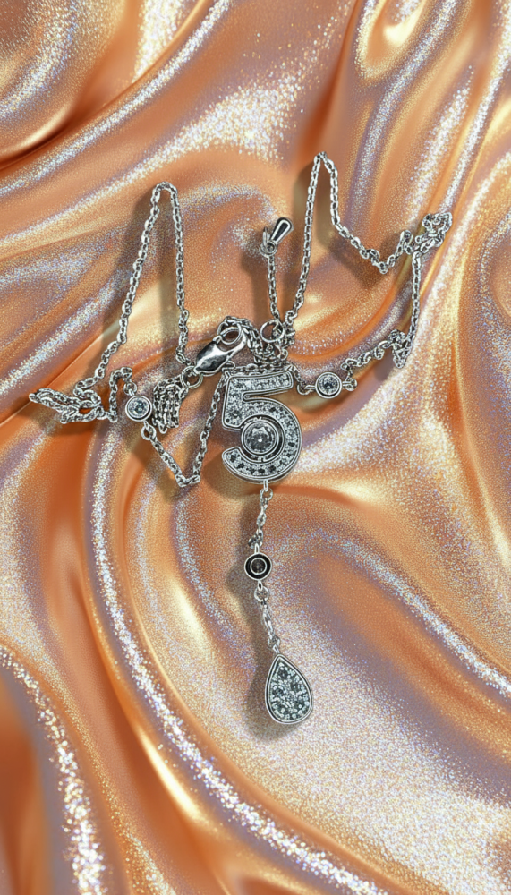 - قلادة مركزية على شكل الرقم "5" متلألئة بالكامل 🌸.