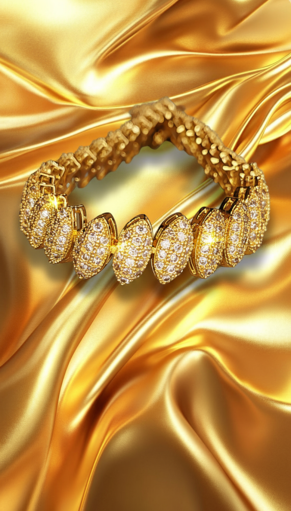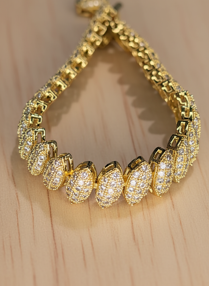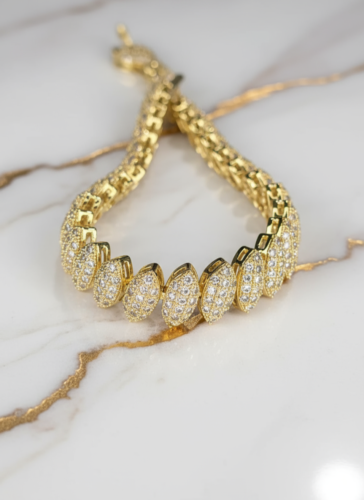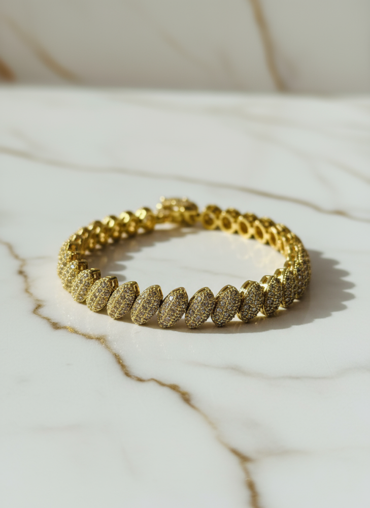تألقي بإطلالة استثنائية مع سوار ذهبي مرصع بالكامل، يجمع بين الفخامة والتصميم الراقي في قطعة واحدة. سوار "تنس" مرن ومتصل، يلتف حول المعصم بسلاسة، مع تصميم مستوحى من شكل الماركيز أو حبة القهوة، ما يمنحه بريقاً مستمراً ومتألّقاً.