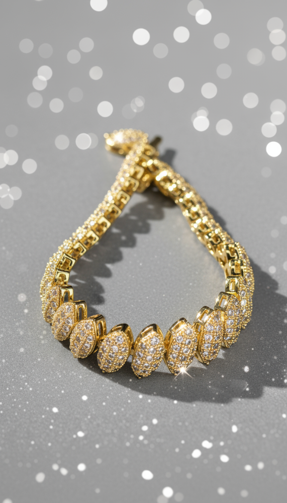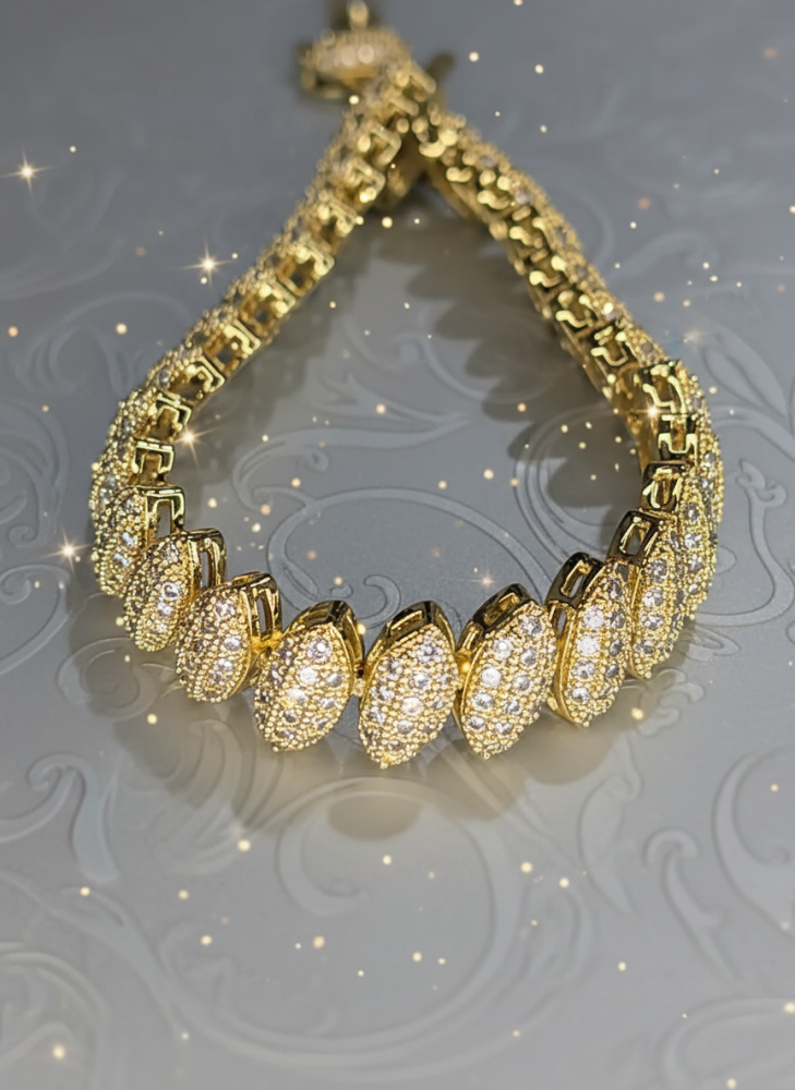 سوار فاخر يسطع بالبريق على المعدن الذهبي، ليصبح قطعة استعراضية تلفت الأنظار في كل مناسبة. مثالي للسهرات والمناسبات الخاصة، ويضيف لمسة من الأناقة الملكية والفخامة لأي إطلالة.