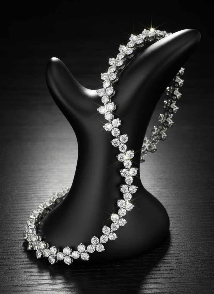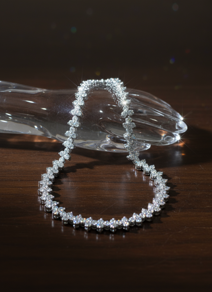 سلسلة مرنة من الوحدات المتصلة، كل وحدة تتكون من ثلاثة أحجار زركون دائرية: حجر مركزي أكبر وحجرتان جانبيتان أصغر لتخلق حركة ديناميكية وبريقًا مستمرًا.