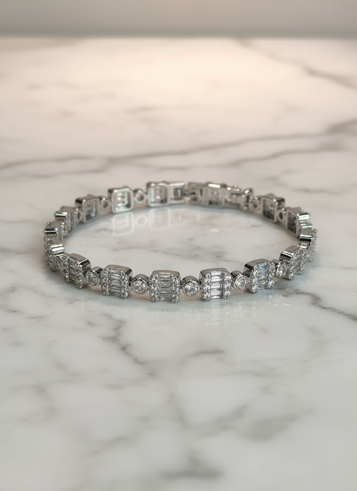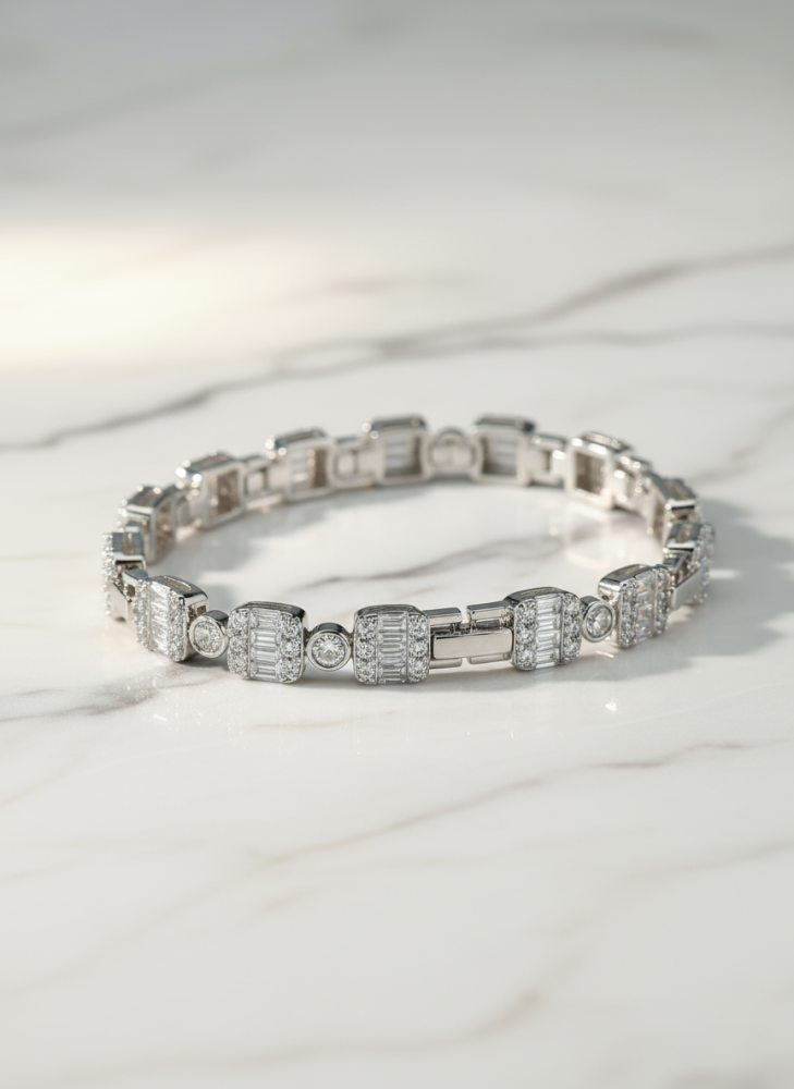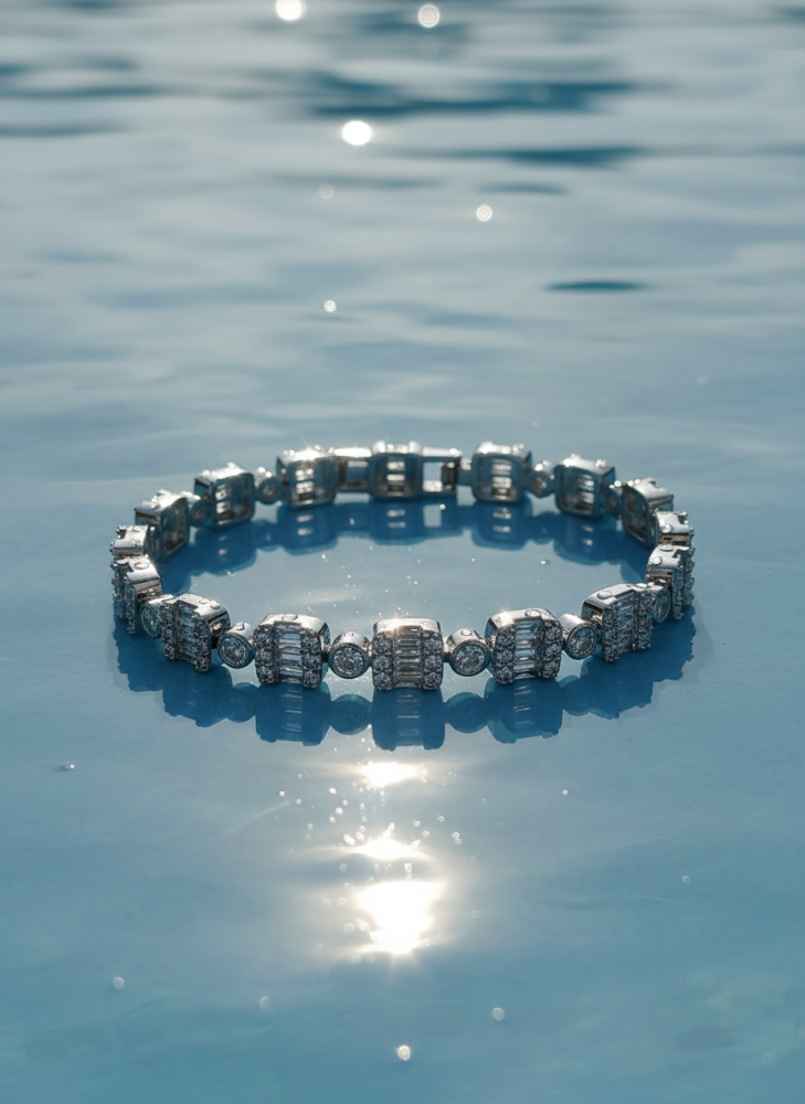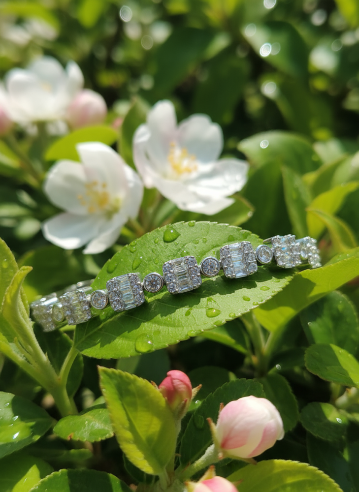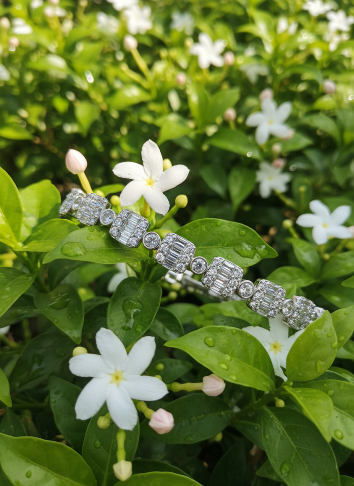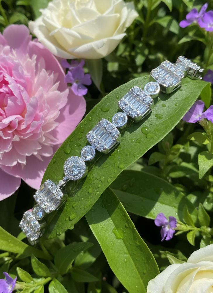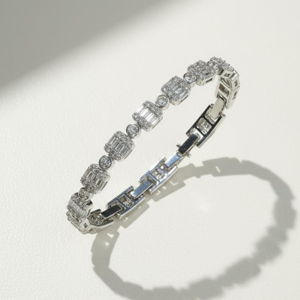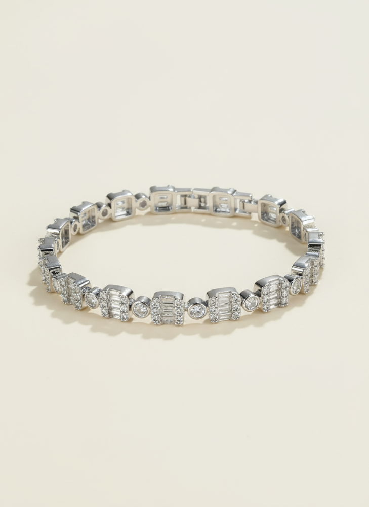 تتألف من سلسلة متناغمة من الوحدات المربعة والدائرية، مرصعة بأحجار زركون لامع عالي الجودة يضاهي الألماس ببريقه، ليأسر الأنظار عند كل حركة. الوحدة المربعة تتألق بأحجار مقطوعة بأسلوب الباغيت الراقي، محاطة بهالة ناعمة من الأحجار الصغيرة التي تضيف وهجاً خلاباً، بينما تأتي الوحدة الدائرية بحجر زركون كبير لامع في إطار معدني أنيق ليمنح التوازن والانسجام.