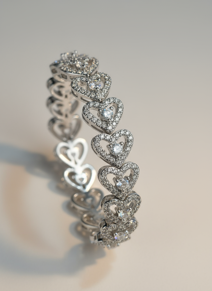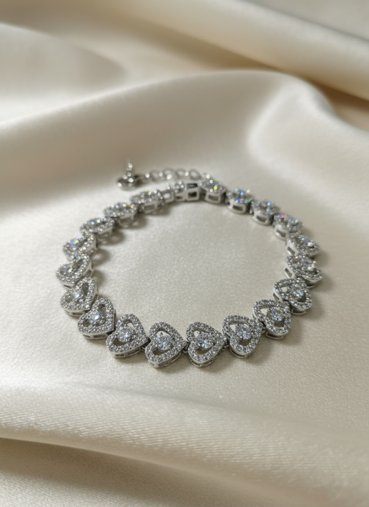 امنحي معصمك لمسة رومانسية ساحرة مع هذا السوار الفضي الفاخر على شكل قلوب، المصمم خصيصاً ليعكس الفخامة والأناقة المطلقة.