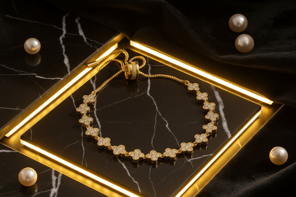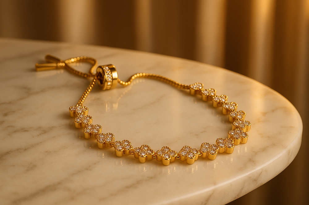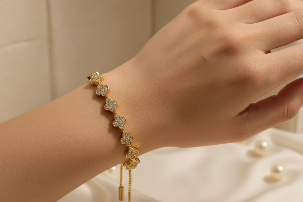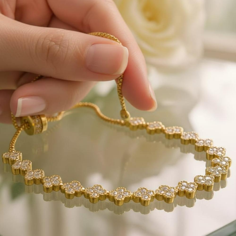 السوار يتكون من سلسلة مرنة متصلة بوحدات زخرفية لطيفة على شكل فراشات أو أشكال مميزة، تمنح معصمك مظهراً أنثوياً ومرحاً 💖.